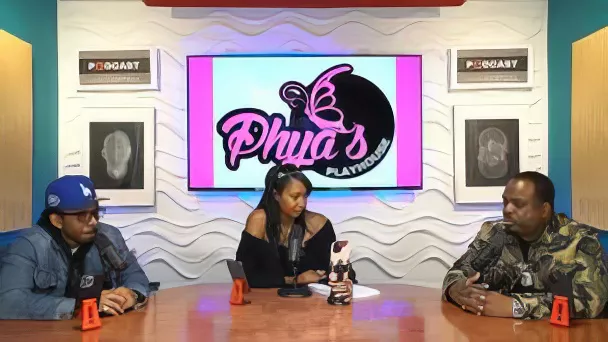 Phya Storm sits with actor, producer, and director Markuann Smith, the Executive Producer of Epix series drama Godfather of Harlem along with actor/voice actor Corwin Tuggles, recognized for his vocal contributions for Tyrone from Backyardigans.